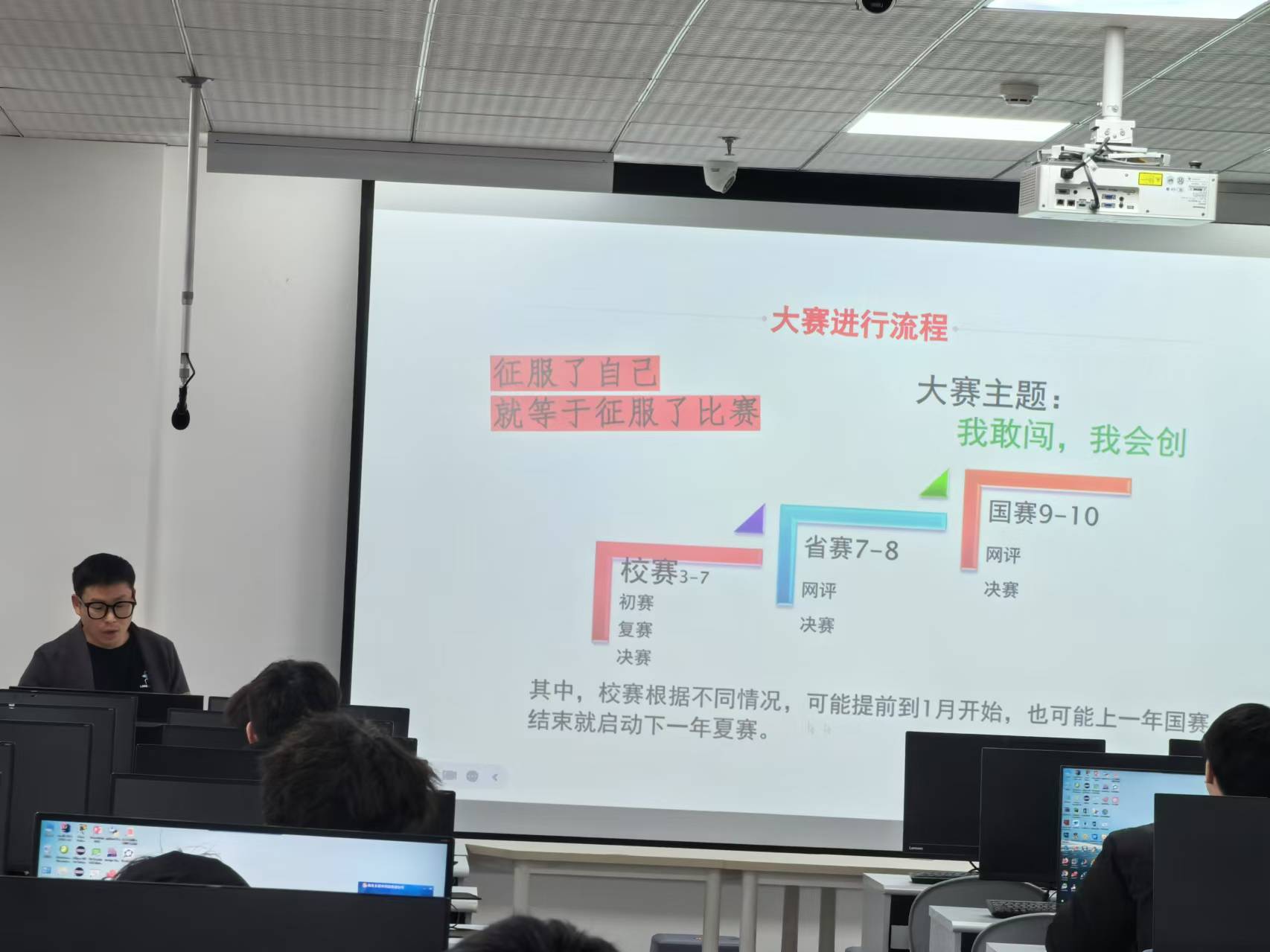 为深化“以赛促学、以赛促教、以赛促改”育人理念,培育学生创新思维与实践能力,学院于2025年3月19日12时40分在学生活动中心905教室举行“中国国际大学生创新大赛”“中国大学生计算机设计大赛”“‘挑战杯’全国大学生课外学术科技作品竞赛”专题培训会暨学科竞赛启动仪式。