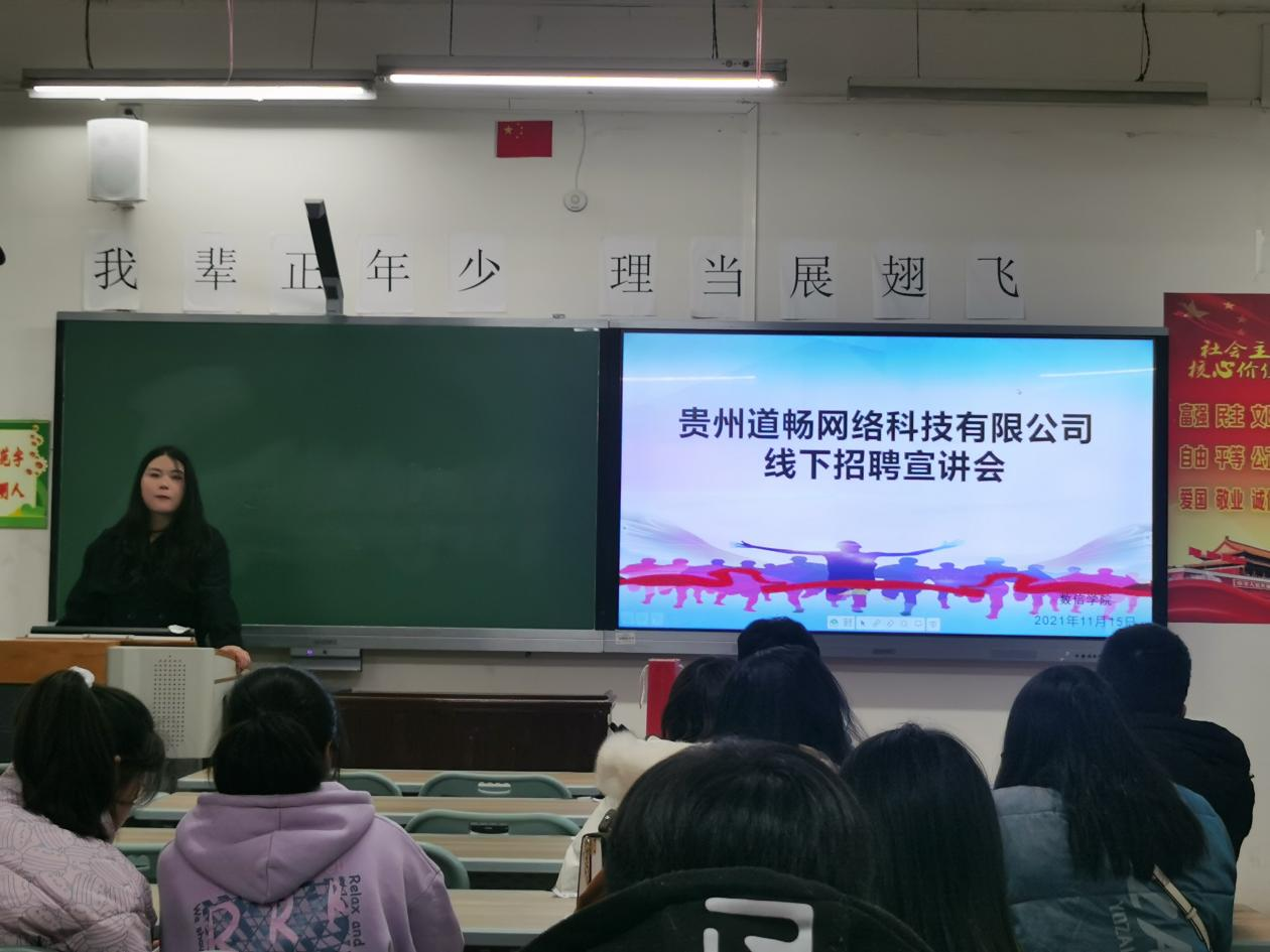 2021年11月15日下午14:30,贵州道畅网络科技有限公司线下招聘宣讲会在永利集团数信学院一教1104教室举行,我院18级计本、18级软工、18级信计3个班共35人参加了招聘宣讲会。